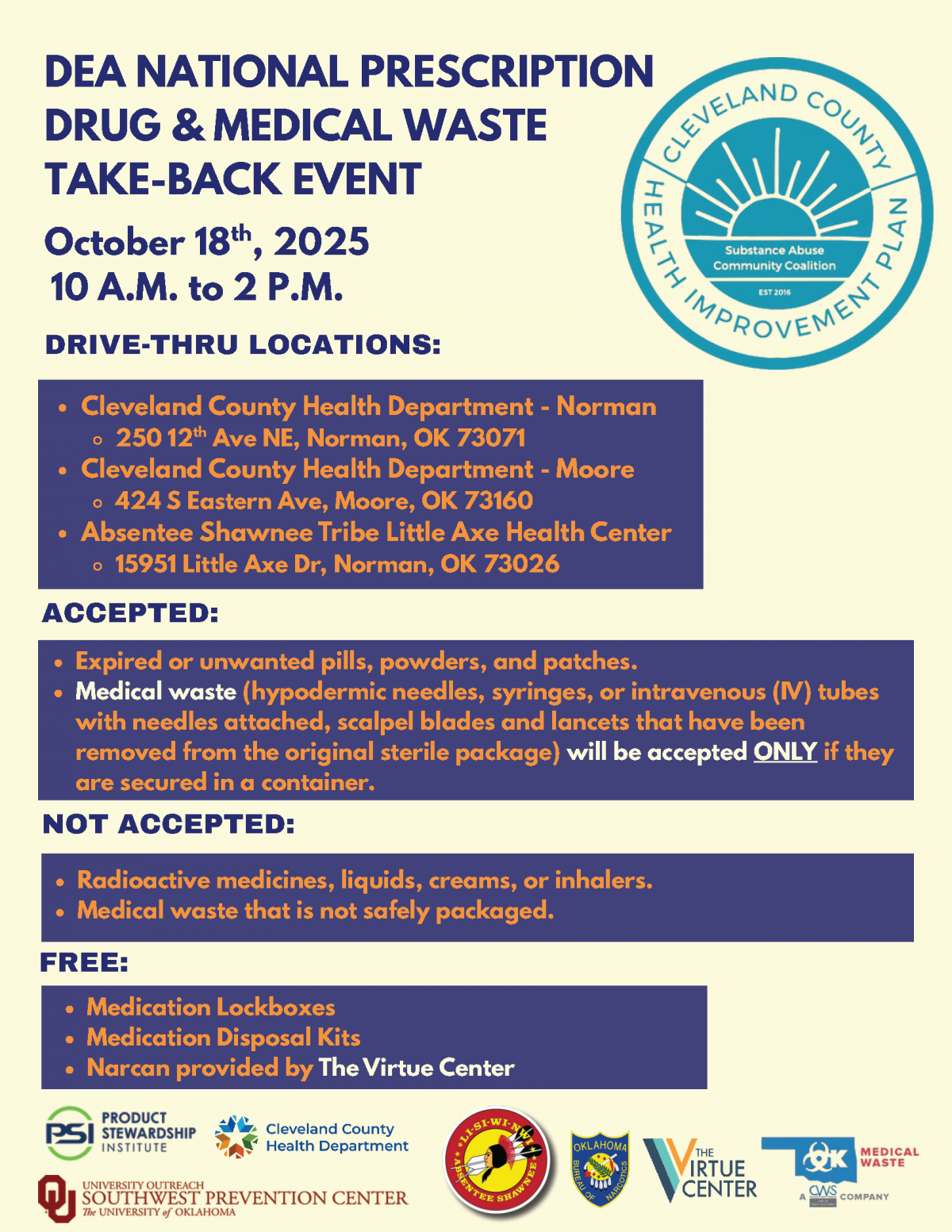 Join the Cleveland County Health Improvement Plan Substance Abuse Community Coalition for the DEA National Prescription Drug & Medical Waste Take-Back Event! This is a FREE and secure way to protect our community and environment from potential harm caused by improper disposal.
