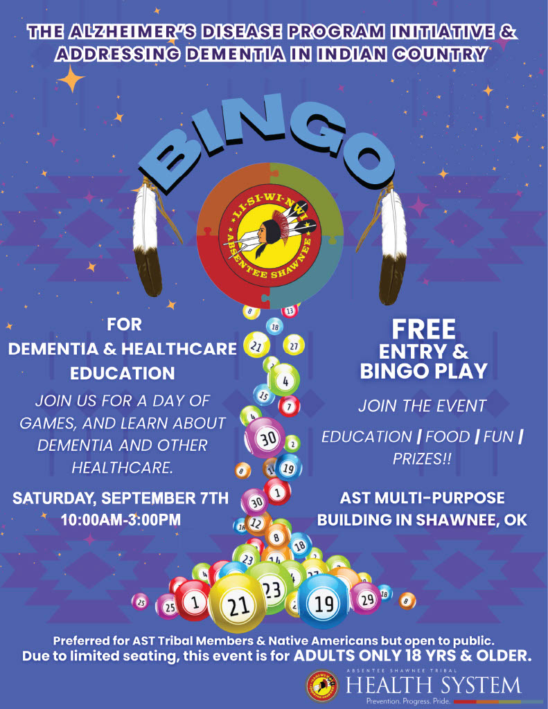 The Dementia Services grants staff is pleased to announce that we will host a fantastic Bingo Event on Saturday, September 7, from 10:00 a.m. to 3:00 p.m. at the AST Multipurpose Building at the Absentee Shawnee Tribal Complex in Shawnee!