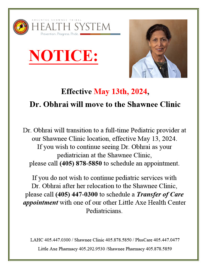 If you do not wish to continue pediatric services with Dr. Obhrai after her relocation, please call (405) 447-0300 to schedule a Transfer of Care appointment with one of our other Little Axe Health Center Pediatricians.