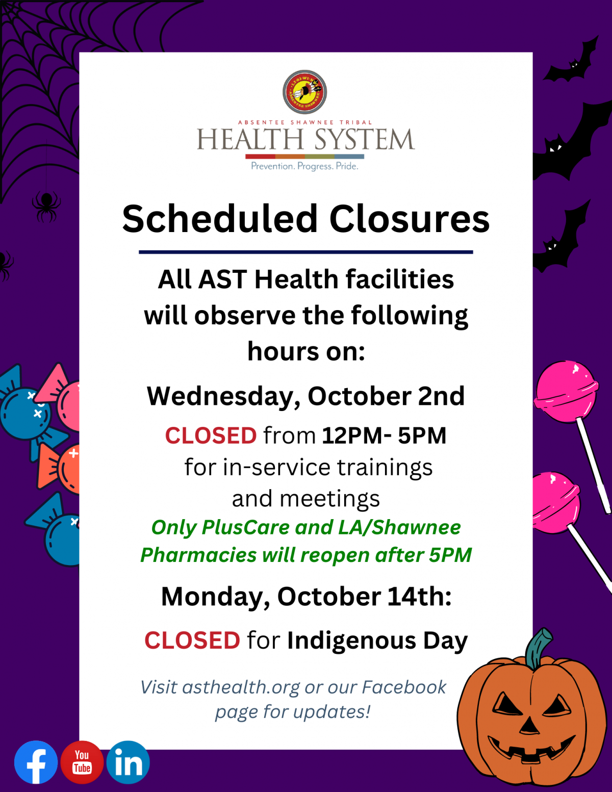 - Wednesday, October 2nd, from 12PM-5PM (Only PlusCare and LA/Shawnee Pharmacies will reopen at 5PM)